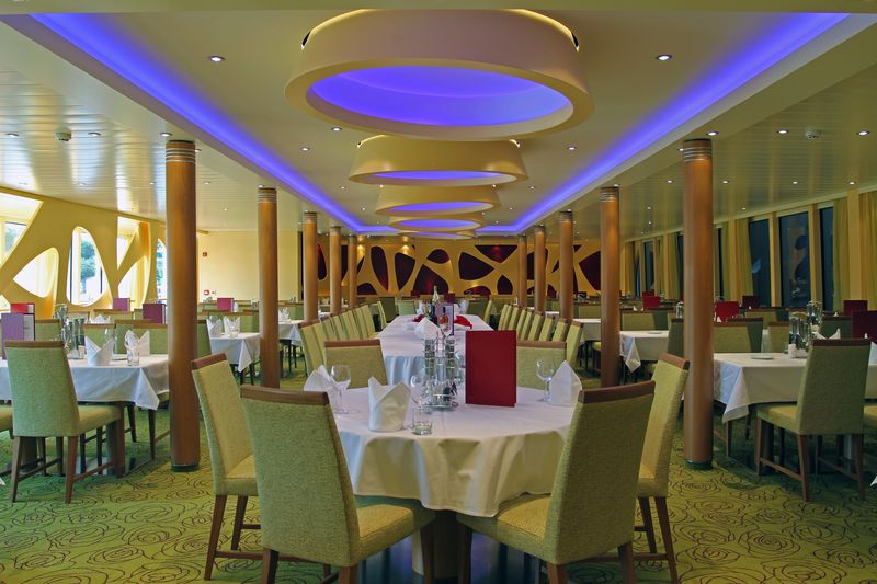 Die mediterrane Küche sowie die Tatsache, dass kein Galadinner sondern ausschließlich Buffet und Live-Cooking angeboten werden, machen das Schiff wirklich attraktiv. Das ausgewogene und frische Farbkonzept, welches sehr an eine bekannte Kussmundflotte im Hochseebereich erinnert, unterstützt diesen Charakter nochmals.