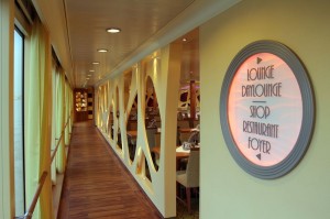 Bei einem ersten Schiffrundgang fallen im Gastronomiebereich weitere Besonderheiten ins Auge. Wie schon auf den älteren A-ROSA Schiffen findet man auch hier die beliebten Buffets. Der Restaurantbereich ist aber nicht wie bei den meisten Flussschiffen durch eine zentrale Tür zugänglich sondern seitlich von einer Art Galerie aus. Diese Galerie verbindet das Foyer mit der Lounge im Bug. Luftige und verspielte Designelemente trennen diesen Galeriegang vom Restaurantbereich, so dass der Gast auch vom Sitzplatz den Panoramablick nach außen genießen kann. Gestört fühlen sich die Restaurantgäste durch den Galeriegang keinesfalls, wie ich auf Nachfrage von Gästen bestätigt bekommen habe. Mein eigener Eindruck war damit genau richtig.