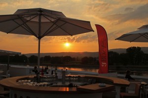 Aber zurück zur A-ROSA SILVA. Abgesehen davon, dass das 135m lange und 11,40m breite Schiff schon äußerlich eine imposante und äußerst elegante Erscheinung ist und sich durch das bekannte Rosenblätter-Dekor samt Kussmund hervorhebt, fallen bei einer Einschiffung über das Oberdeck gleich weitere Besonderheiten auf. Neben der bereits erwähnten Außenbar und dem riesigen Restaurant-Außenbereich der von Sonnensegeln überspannt wird, entdeckt man schnell den für ein Flusskreuzfahrtschiff sehr großzügig dimensionierten, beheizten Pool.