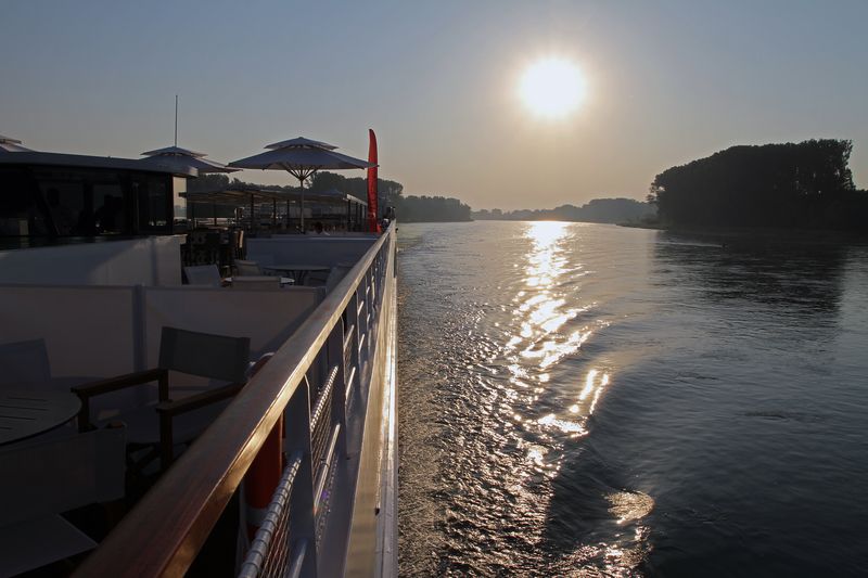 Bereits am Mittag hieß es dann „Leinen los“ mit Kurs auf einen der historischsten Flussabschnitte Europas. Aus den BOSE-Boxen an Deck der A-ROSA SILVA ertönte die A-ROSA Auslaufmelodie „Following my heart“. In Kombination mit den mediterranen Temperaturen und dem strahlenden Sonnenschein erzeugte das durchaus Gänsehautatmosphäre. Für manche Menschen mag das kitschig sein aber gerade diese Momente prägen sich in den Köpfen vieler Gäste positiv ein – so auch bei mir.