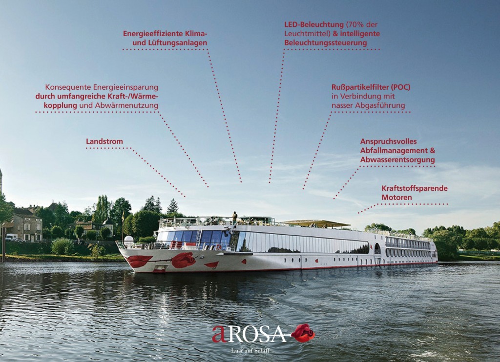 Wie bereits erwähnt, feierte A-ROSA in diesem Jahr 10-jähriges Jubiläum. Begonnen hat die erfolgreiche Geschichte genau genommen zwischen den Jahren 2000 und 2003. Zunächst startete Seetours (ein gemeinsames Unternehmen der britischen P&O und der Deutschen Seereederei /DSR) mit zwei Fluss- und einem Hochseeschiff. An die Taufe der A-ROSA BLU in Hamburg am 14. Juni 2002 erinnere ich mich heute noch gerne. Im April 2004 wechselte die A-ROSA BLU dann zu AIDA und wurde bei der Werft Blohm & Voss in Hamburg in zwei Wochen umgebaut. Die Marke A-ROSA lebte bei der DSR weiter. Im laufe der Jahre erfolgten weitere Umstrukturierungen. 2009 wurde die A-ROSA Flussschiff GmbH aus Rostock von den beiden Geschäftsführern Lars Clasen und Markus Zoepke sowie dem Finanzinvestor Waterland aus Düsseldorf übernommen und aus der DSR ausgegliedert. Das ehemalige Schwesterunternehmen A-ROSA Resorts ist seither ein komplett eigenständiges Unternehmen, verwendet aber weiterhin das bekannte A-ROSA Rosenlogo. Wie bereits im Beitrag erwähnt, ist die damalige Verbindung zu AIDA auch heute noch deutlich sichtbar. Neben dem Innendesign fällt auch die äußere Bemalung ins Auge, denn sowohl die Hochseeschiffe von AIDA Cruises als auch die Flusschifffe von A-ROSA Flusskreuzfahrten werden von einem roten Kussmund geziert, der bei A-ROSA jeweils noch durch eine Rose ergänzt wird. A-ROSA hat die moderne Flusskreuzfahrt geprägt, verzichtet z.B. auf Captain’s Dinner, feste Sitzplätze und Essenszeiten oder eine Krawattenpflicht und bieten hochwertige Buffets an. Alle Schiffe zeichnen sich durch einheitliche Standards aus und verfügen so z.B. über SPA- und Fitnessbereiche, einen Pool und bordeigene Fahrräder.