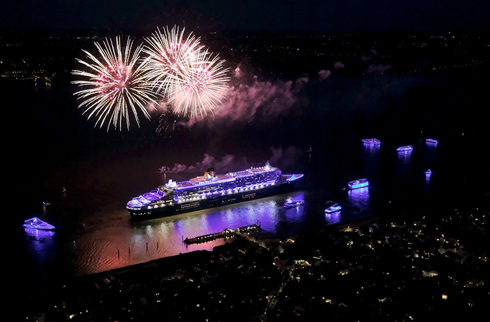 Die besten Plätze hatten die Gäste an Bord der Cunard Flotte, die an Deck das Spektakel über ihren Köpfen aus nächster Nähe und samt Live-Kommentar miterleben konnten.