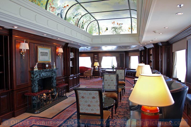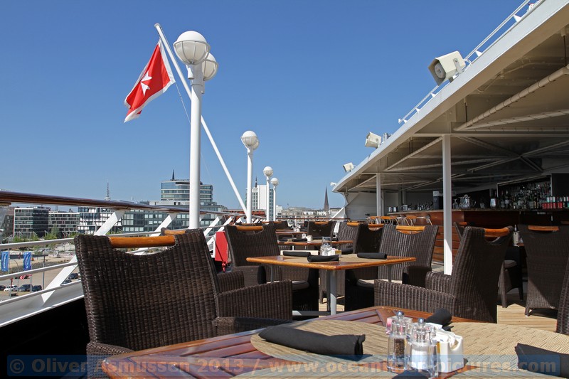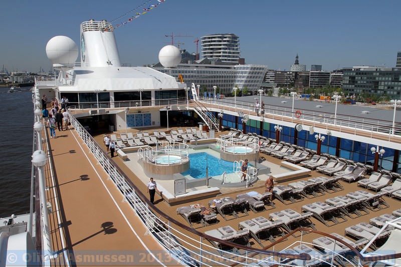 Diese sind so bequem, dass sicherlich durchaus der eine oder andere Kreuzfahrtgast sein Mittagsschläfchen an Deck halten wird. Eine Kopf- bzw. Nackenstütze und ein großes Handtuch gehören selbstverständlich dazu. Auch wenn weder das Pooldeck noch die umrundende Galerie mit Echtholz belegt sind, bleibt der elegante und stilvolle Charakter erhalten. Der Pool selbst wird sicherlich mit seiner Größe keine Weltrangliste anführen aber sollte für ein Schiff dieser Größe dennoch ausreichen.