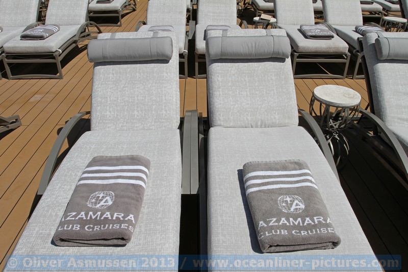 Der Poolbereich wirkt auf den ersten Blick recht voll gestellt mit Sonnenliegen, was allerdings bedingt durch das Fahrtgebiet in kühleren Nordlandregionen begründet ist. Die Liegemöglichkeiten von der oberen Galerie sind mit in den windgeschützten Poolbereich „gewandert“. Abgesehen davon kann man immer noch problemlos zwischen den Reihen der Sonnenliegen entlang laufen. Bemerkenswert sind die dicken und gemütlichen Auflagen aller Sonnenliegen!