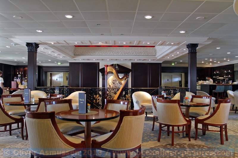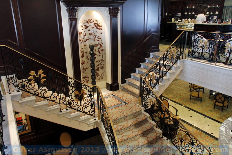 Das Mosaic Cafe bildet den zentralen Punkt und das kleine aber schmucke Atrium der Azamara Quest. Wir hörten in diesem Zusammenhang von einem Vergleich mit der Titanic. Diesen können wir zwar überhaupt nicht sehen, weil weder der Stil noch die Größe identisch sind aber einen bleibenden Eindruck hinterlässt die elegante, von Deck 4 hinaufführende und sich dann zur Back- und Steuerbordseite hin teilende Treppe allemal. Der gesamte Bereich des Atriums auf Deck 4 und 5 ist farblich wunderbar abgestimmt und versprüht für unser Empfinden das Flair schmucker Hotels in Venedig. Toller Blickfang des Mosaic Cafes ist eine Harfe, welche zum Atrium hin positioniert ist.