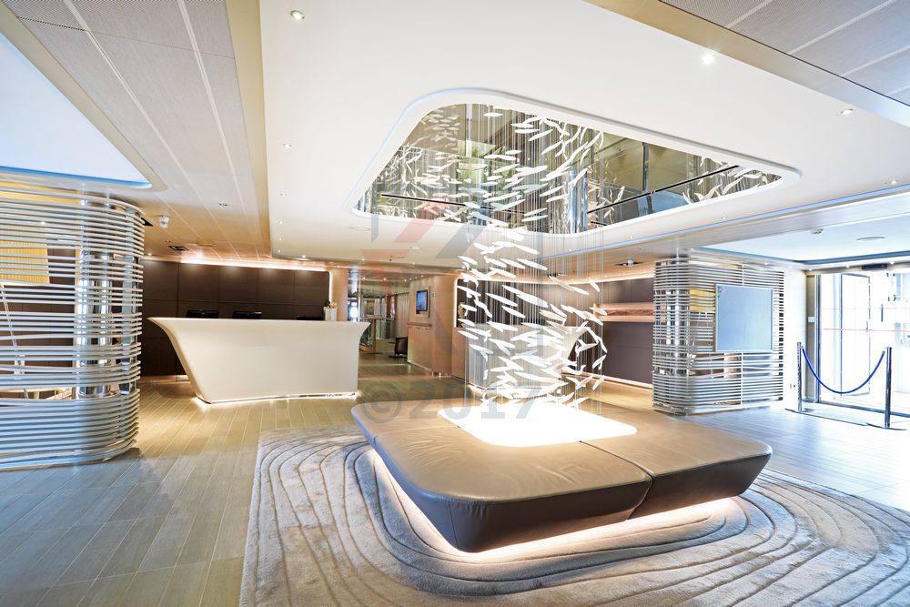 Der zentrale Mittelpunkt bzw. das Herz der Le Soléal liegt auf Deck 3. Hier sind nämlich die Rezeption, das Ausflugsbüro, ein Shop sowie das bordeigene Hospital untergebracht. Unübersehbar ist die moderne Skulptur, deren kleinen Elemente an einen Schwarm Fische erinnert, welcher munter in einem Aquarium seine Runde dreht und dabei das Atrium zwischen Deck 03 und Deck 04 durchschwimmt.