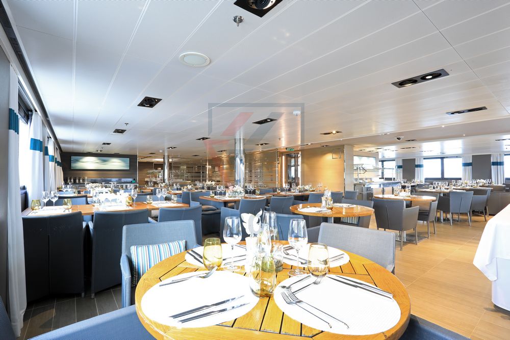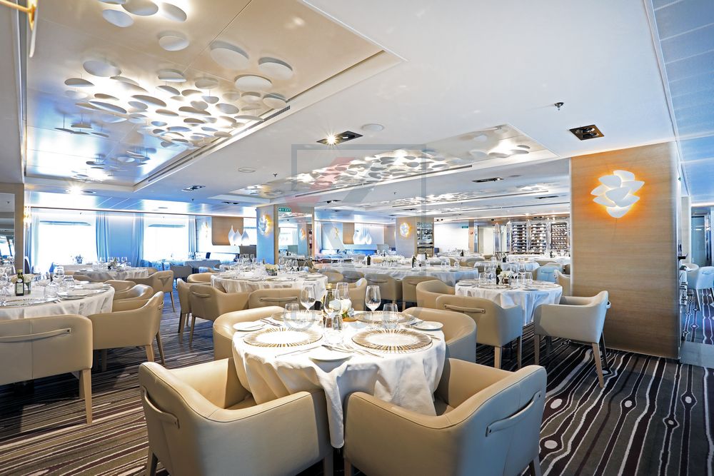 Ebenfalls auf Deck 2 gelegen ist das Gourmetrestaurant, welches sich in einem eleganten und zurückhaltend freundlichen Stil präsentiert. An der Decke sorgen ansprechende, moderne Lichtinstallationen für die richtige Atmosphäre und stehen in wunderbarem Einklang mit den Wandleuchten. Die verschiedenen Lichtquellen unterstreichen optisch die Reise ins Land der kulinarischen Genüsse.