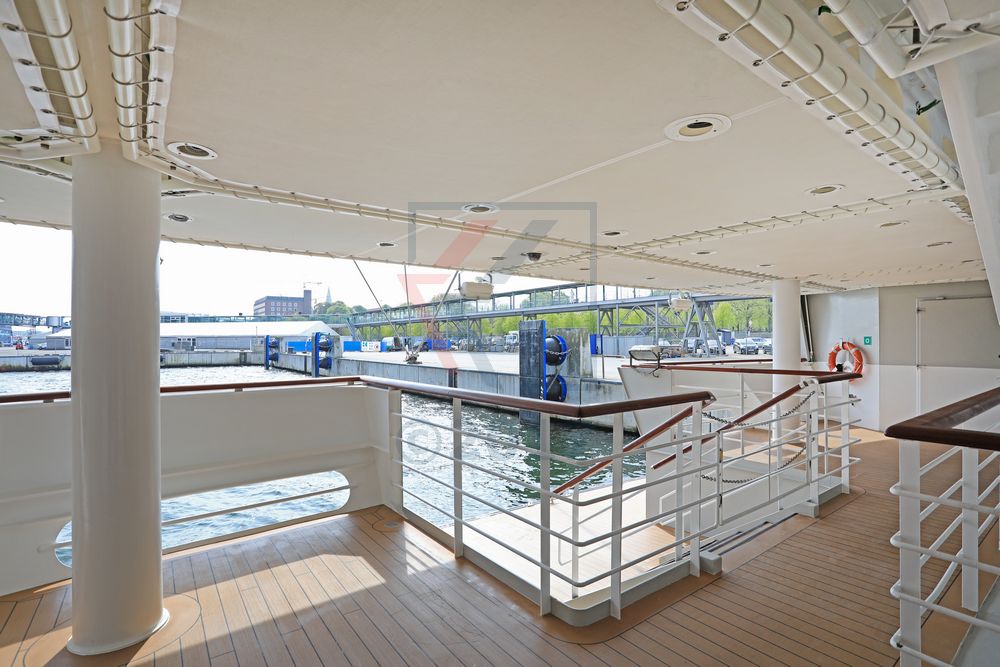 Beidseitig der Lounge verbindet im Außenbereich jeweils eine Treppe das Deck mit dem darüberliegenden Sonnendeck. Das ist sehr praktisch, denn so bleibt es dem Gast erspart, erst wieder zum Treppenhaus zurück laufen zu müssen um das Sonnendeck zu erreichen.