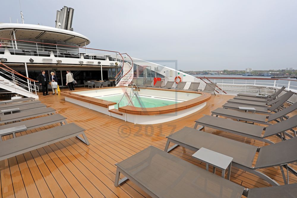 Direkt integriert in das Achterdeck ist ein für diese Schiffsgröße recht üppig bemessener Swimmingpool. Über zwei geschwungene Treppen besteht eine Verbindung zwischen dem Außenbereich auf Deck 6 und Deck 7.