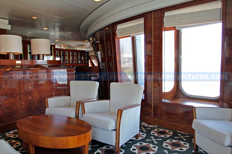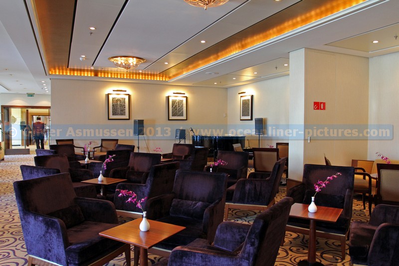 Nach einem Blick in den Golden Lion Pub fahren wir mit dem Aufzug direkt auf Deck 7. Deck 4-6 sind reine Kabinendecks. Im Heckbereich speisen die Gäste im Queens Grill sowie im Princess Grill Restaurant. Besonders gemütlich und stilvoll präsentiert sich die Queens Grill Lounge gegenüber des Queens Grill Restaurants.