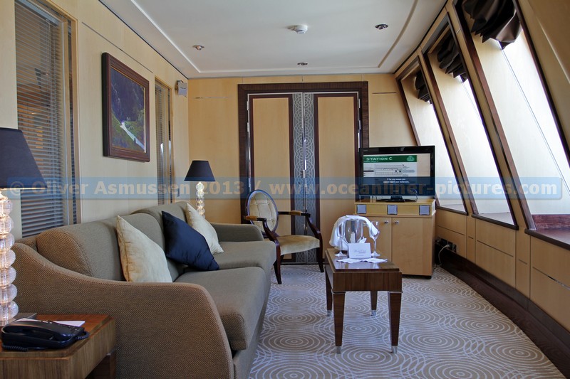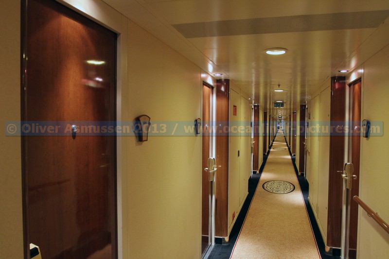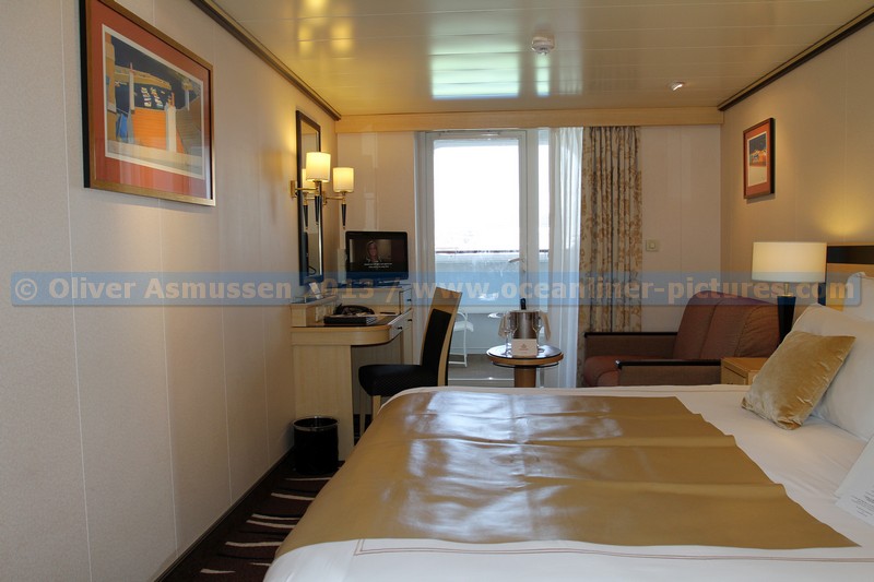 Da die Kabinen für die nachfolgenden Gäste noch nicht alle verschlossen waren, hatten wir die Gelegenheit Innenkabinen, Balkonkabinen und eine der Royal Suiten zu besichtigen. Selbst die Standard Innen- und Außenkabinen sind mit 15m² ausreichend dimensioniert. Deutlich mehr Platz bieten die Balkonkabinen mit 23-25m². Die Ausstattung der Kabinen entspricht dem heutigen Standard; was uns in diesem Zusammenhang jedoch etwas wunderte sind die Stoffvorhänge der Duschen bis in die obersten Kategorien hinauf. Zumindest in den Suiten würde man sicherlich Glastüren in den Duschen vermuten.