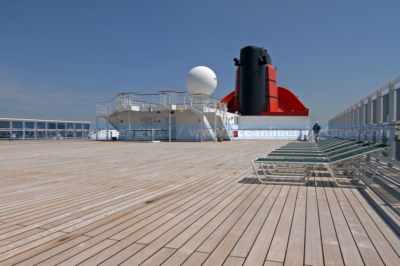 Und damit kommen wir auch zum letzten Highlight der Queen Mary 2 – die Freidecks! Natürlich mit Echtholz belegt. Eine Filmleinwand wird man hier vergeblich suchen, dafür aber Platz ohne Ende vorfinden. Stilvolle Deckchairs und Sitzgruppen laden zum Sonnenbaden ein oder einfach nur, um der Seele beim Blick über das Meer freien Lauf zu lassen. Der Heckbereich der Queen Mary 2 ist in verschiedenen, weitläufigen Terrassen angelegt, was eine absolute Ausnahme bei Schiffen neueren Baujahrs darstellt.
