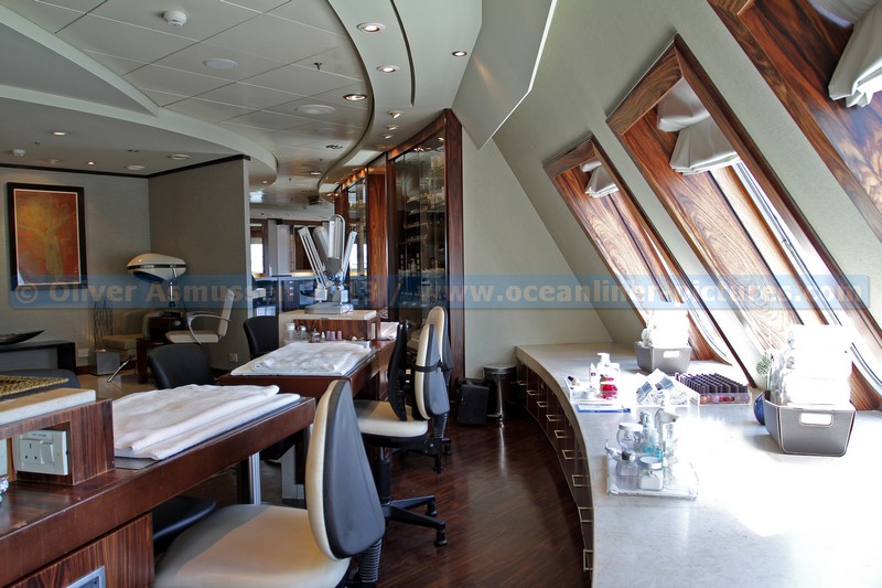 Den gesamten Bugbereich nehmen der elegante Canyon Ranch Spa Club sowie ein modern ausgestattetes Fitness Center ein. Im Treppenaufgang zum Schönheits-Salon plätschert ein kleiner Wasserfall über zwei Decks und stimmt perfekt auf den Aufenthalt ein. In den luxuriösen Wohlfühlwelten erwartet den Gast eine reiche Auswahl an Beauty- und Wellness-Angeboten von der Hot-Stone-Massage über Seegras-Behandlungen bis zum Ganzkörper-Peeling. Selbstverständlich sind auch ein neuer Haarschnitt, eine Maniküre und ein neues Make-up kein Problem. Auch hier gilt wieder – es gibt größere Spa-Bereiche aber dieser ist wirklich ein Refugium der Ruhe und Entspannung für sich.